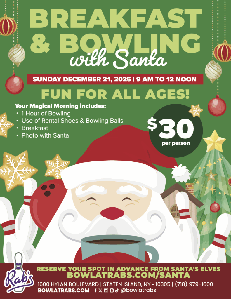 Breakfast & Bowling with Santa Join us for a Magical Morning on the lanes with Santa! Sunday December 21, 20259:00 AM to 12 Noon Your Magical Morning includes:– 1 Hour of Bowling– Use of Rental Shoes & Bowling Balls– Breakfast– Photo with Santa DON’T GET SHUT OUT! RESERVE YOUR SPOT TODAY!